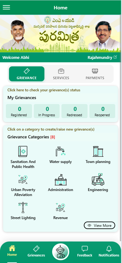 పట్టణ మున్సిపల్ సేవలకు సంబంధించిన సమస్యలను ఫిర్యాదు చేయడానికి మరియు వాటి పరిష్కారం పొందడానికి.