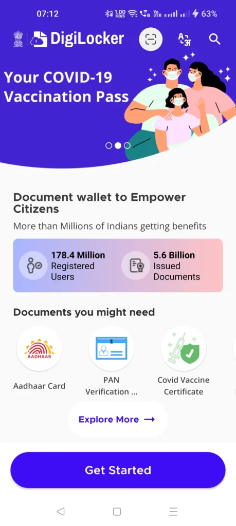 డిజి లాకర్ ఆప్ ఓపెన్ చేసిన తర్వాత కింది విధంగా చూపిస్తుంది. హోమ్ స్క్రీన్ లో Get Started బటన్ పైన క్లిక్ చేయండి.