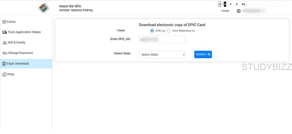 E-EPIC Download ఆప్షన్ పైన క్లిక్ చేసిన తరువాత EPIC no (Voter ID) తో గాని, Reference No తో గాని ఓటర్ కార్డుని డౌన్లోడ్ చేసుకోవచ్చు.