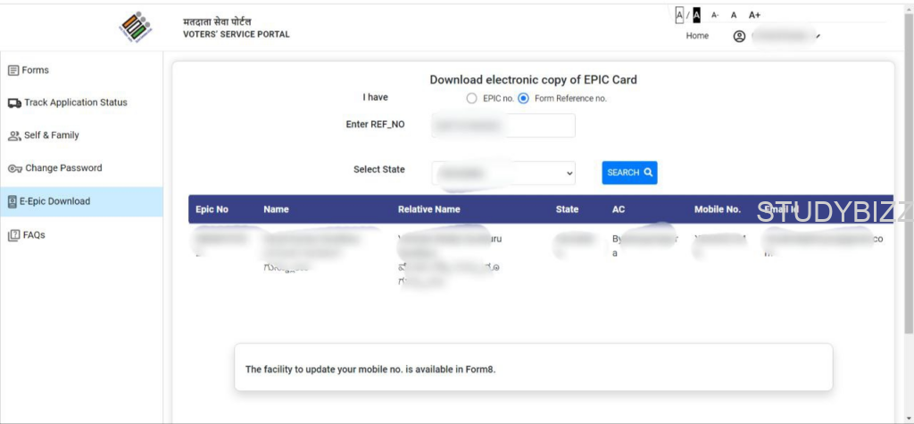 లాగిన్ అయిన తరువాత కింది విధంగా Home Page ఓపెన్ అవుతుంది. ఇప్పుడు E-EPIC Download ఆప్షన్ పైన క్లిక్ చెయ్యండి.
