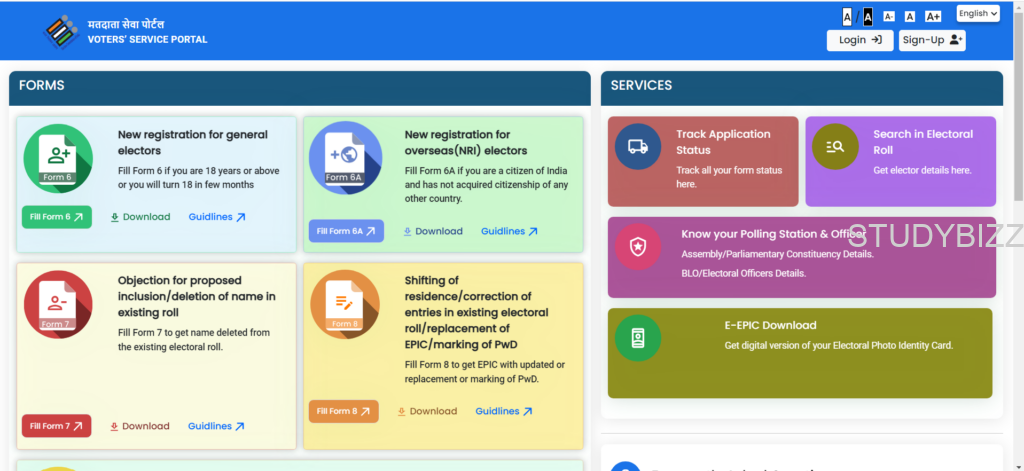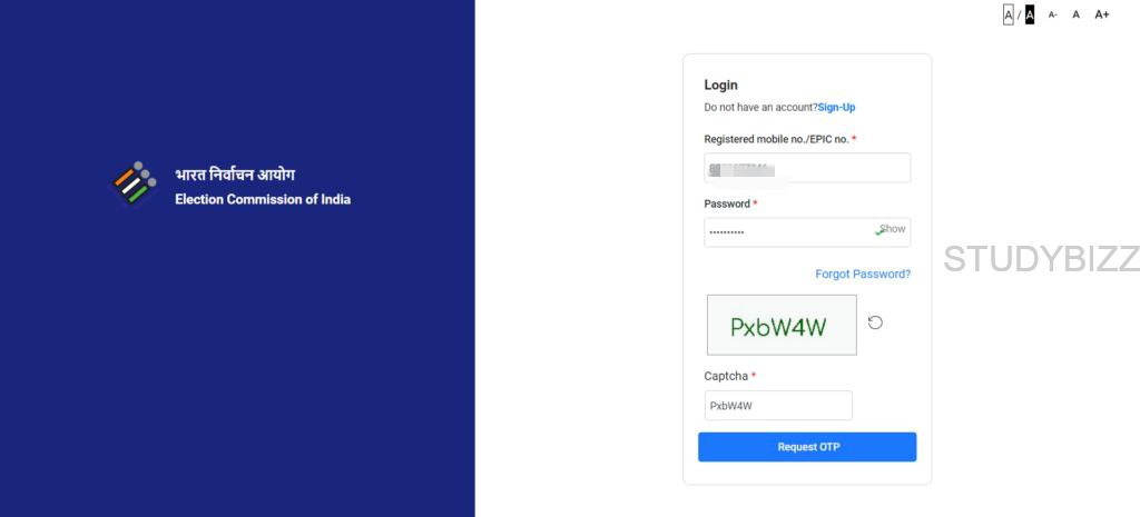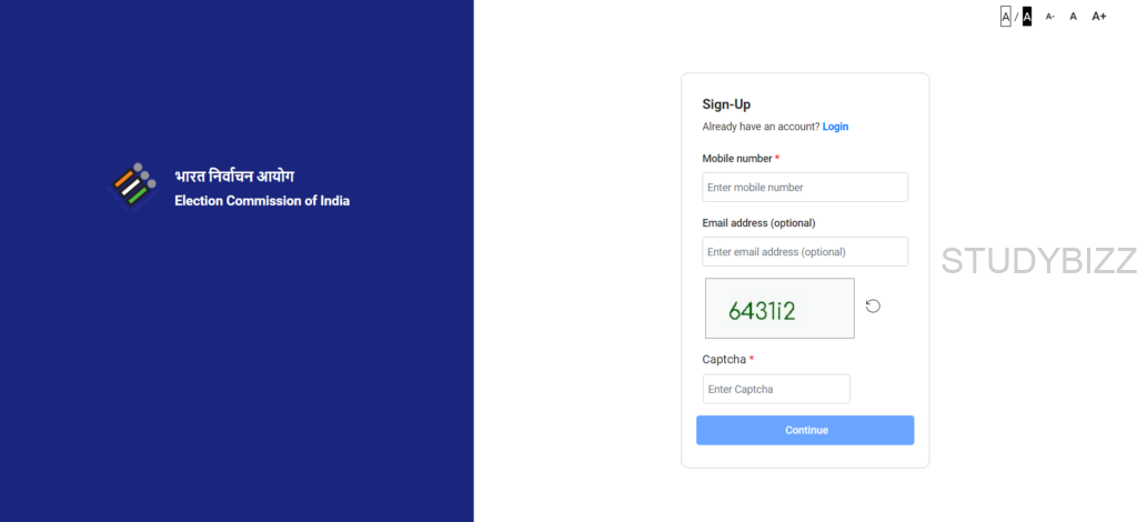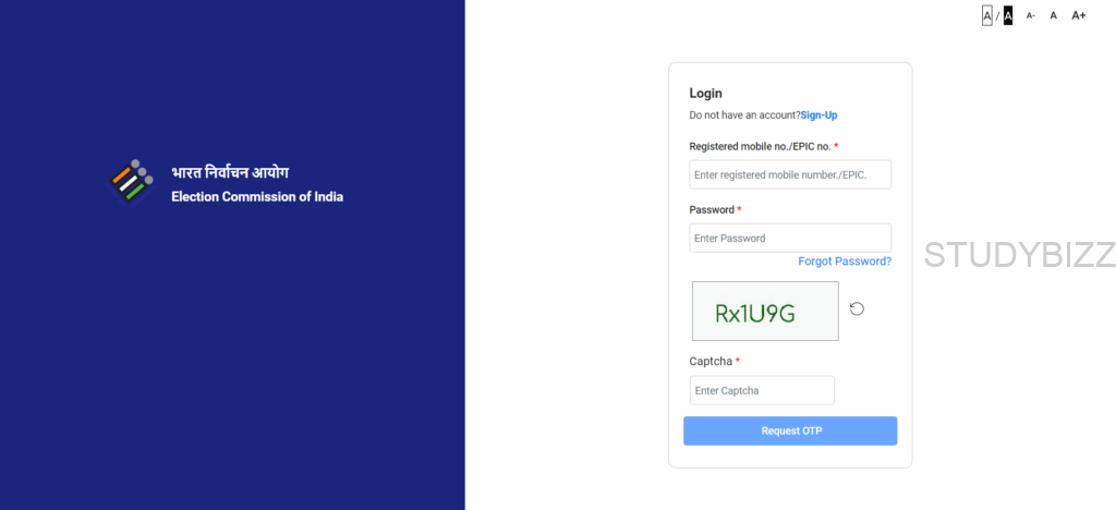 ఎలక్షన్ కమిషన్ వెబ్సైట్ ఓపెన్ అయిన తర్వాత మీకు ఇప్పటికే అకౌంట్ ఉన్నట్టయితే లాగిన్ బటన్ పైన క్లిక్ చేయండి లేదంటే Sign Up ఆప్షన్ పైన క్లిక్ చేయండి