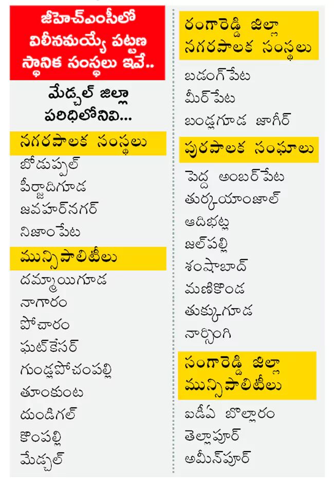 GHMC లో కొత్తగా విలీనం కానున్న నగరపాలక సంస్థలు, మున్సిపాలిటీలు మరియు పురపాలక సంఘాలు ఇవే..