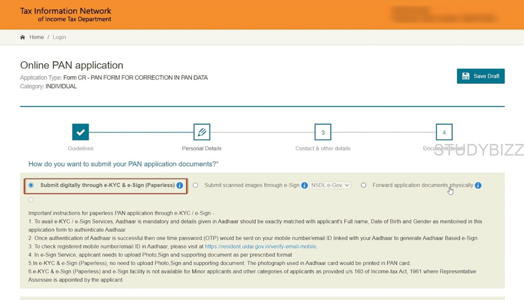 ఆధార్ OTP ద్వారా మొత్తం ప్రక్రియను ఆన్లైన్లో పూర్తి చేయడానికి, మీ పాన్ను అప్డేట్ చేయడానికి మొదటి ఎంపికను ‘Submit digitally through e-KYC & e-Sign (Paperless)’ ఆప్షన్ ని సెలెక్ట్ చేసుకోండి.