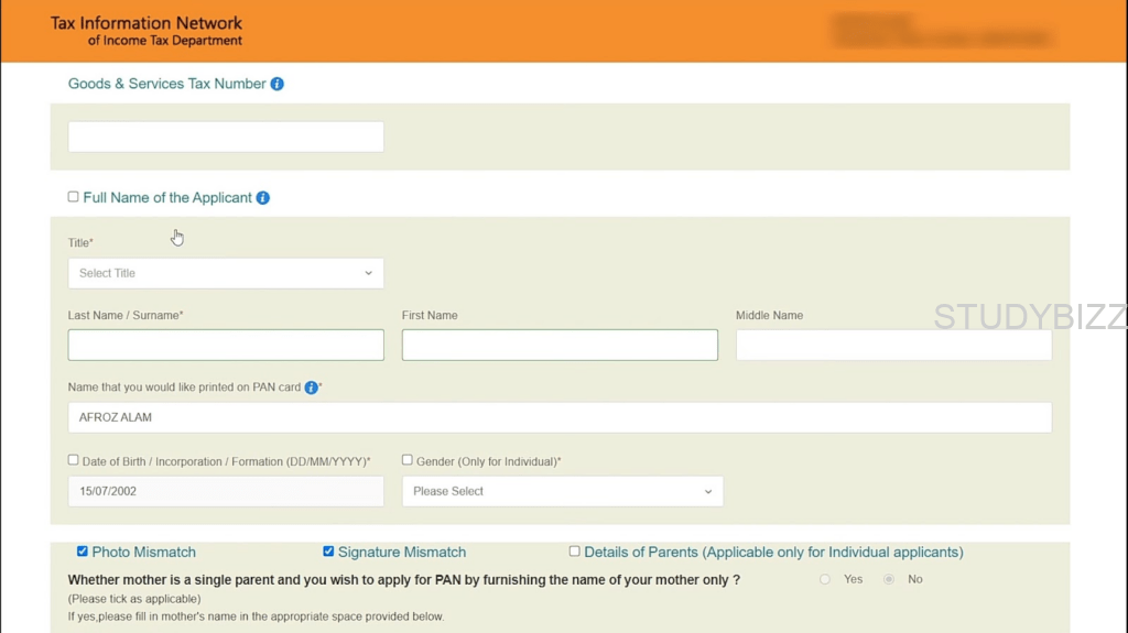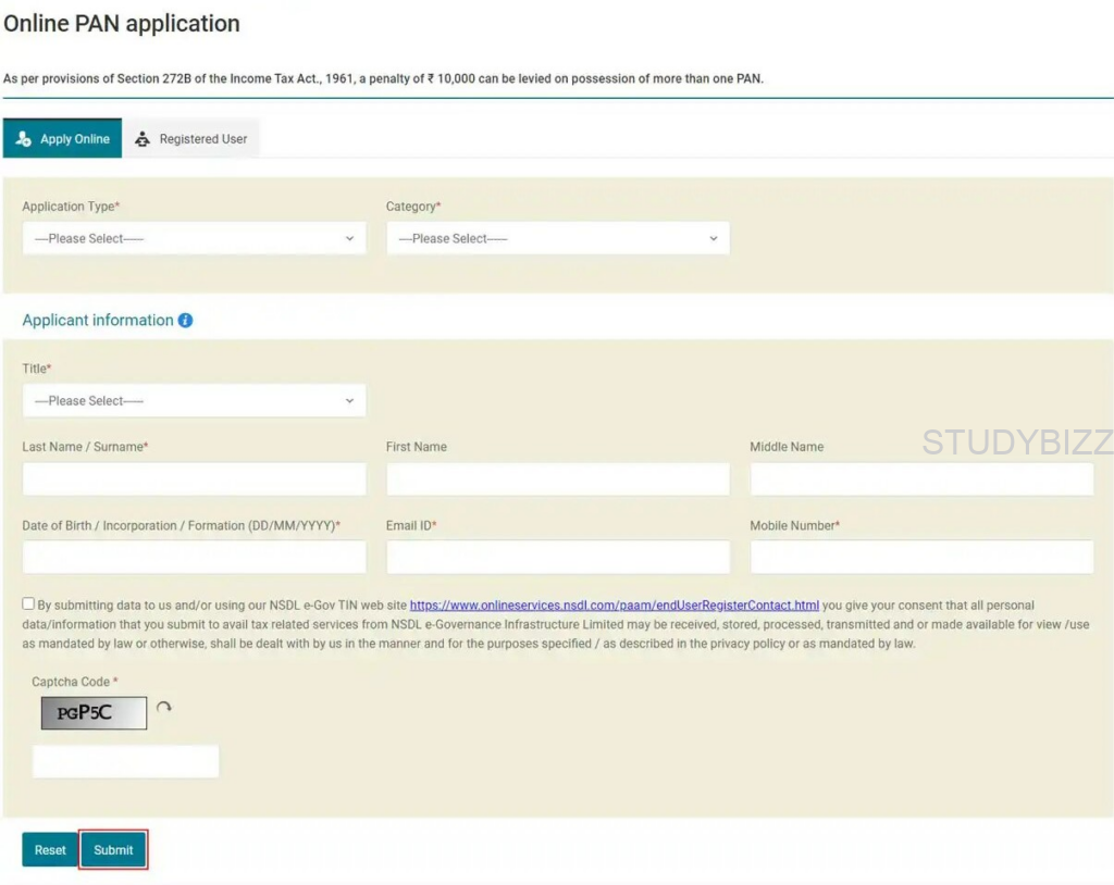Step 5: Apply పైన క్లిక్ చేసిన తరువాత, ఆన్లైన్ పాన్ అప్లికేషన్ను ఫిల్ చెయ్యాలి. ఏ ఏ వివరాలను ఎలా పూరించాలో చూద్దాం.