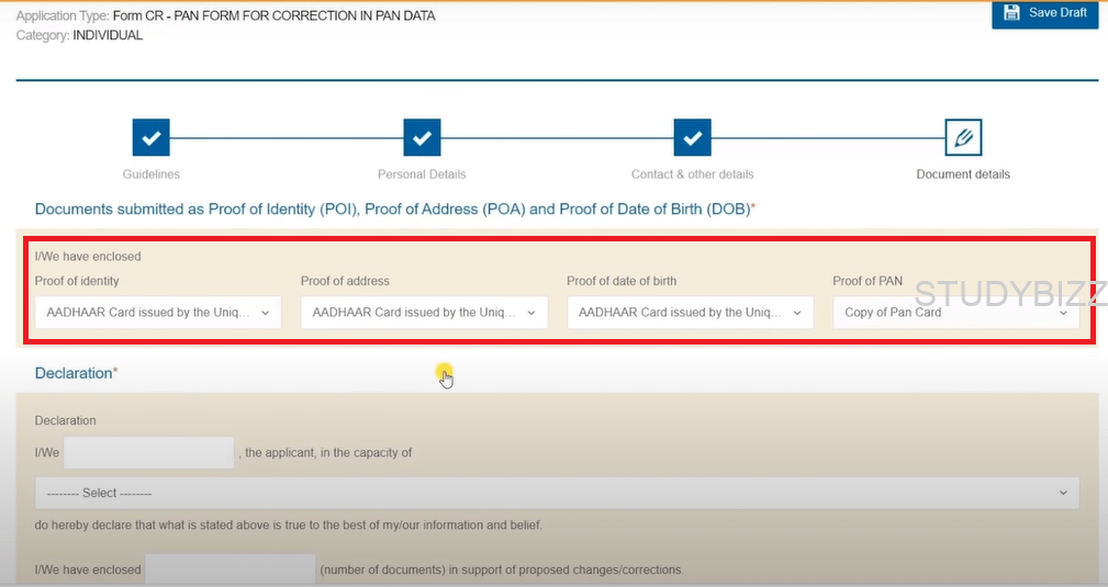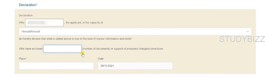 తరువాత డిక్లరేషన్ సెక్షన్ లో కింది వివరాలను ఎంటర్ చెయ్యండి,