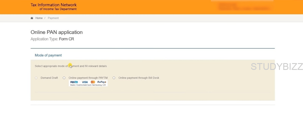 పాన్ కార్డ్ దిద్దుబాటు ఫారమ్ను సమర్పించిన తర్వాత, చెల్లింపు పేజీ కనిపిస్తుంది. వివిధ payment Gateway ల ద్వారా పేమెంట్ చేయవచ్చు. Payment Success అయిన తర్వాత, మీ పేమెంట్ కి సంబంధించిన రసీదు వస్తుంది.