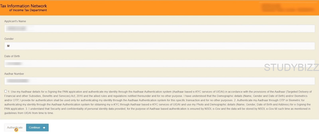 పాన్ కార్డ్ అప్డేట్/కరెక్షన్ ప్రాసెస్ను పూర్తి చేయడానికి, ‘Continue‘ పై క్లిక్ చేయండి. మీరు ఇప్పుడు KYC ప్రక్రియను పూర్తి చేయాలి. నిబంధనలు మరియు షరతులను ఆమోదించడానికి చెక్ బాక్స్ను ఎంచుకుని, ‘Authenticate‘ పై క్లిక్ చేయండి.