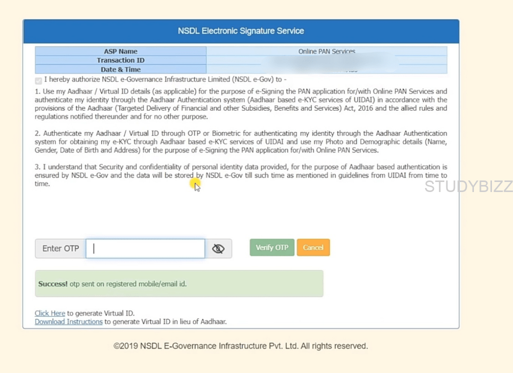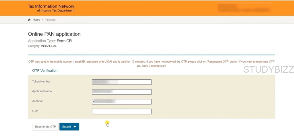 మీ ఆధార్ నమోదిత మొబైల్ నంబర్కు OTP వస్తుంది. OTPని నమోదు చేసి ఆన్లైన్ PAN దరఖాస్తు ఫార్మ్ ను Submit చెయ్యండి.