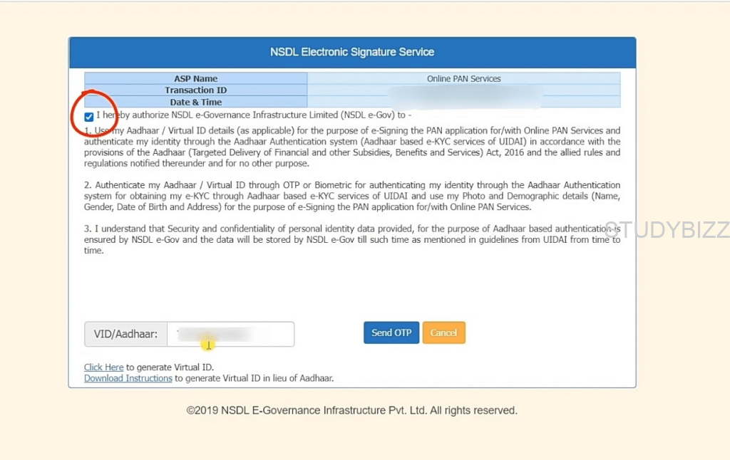 ఇక్కడ, పెట్టెలో టిక్ చేయడం ద్వారా నిబంధనలు మరియు షరతులను అంగీకరించండి. మీ ఆధార్ నంబర్ను నమోదు చేసి, ‘Send OTP’ పై క్లిక్ చేయండి