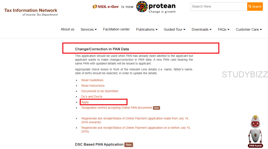 Step 3: తరువాత క్రిందికి స్క్రోల్ చేసి, ‘Change / Correction In PAN Data‘ ఆప్షన్ ఎంచుకోండి. తరువాత చూపించిన ఆప్షన్స్ లో Apply పై క్లిక్ చేయండి.