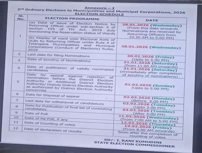 తెలంగాణలో ఎప్పుడెప్పుడా అని ఎదురుచూస్తున్న మున్సిపల్ ఎన్నికలకు అధికారికంగా నగారా మోగింది. రాష్ట్ర ఎన్నికల కమిషన్ మున్సిపల్ ఎన్నికల షెడ్యూల్‌ను విడుదల చేయడంతో రాష్ట్రవ్యాప్తంగా రాజకీయ వాతావరణం వేడెక్కింది. షెడ్యూల్ ప్రకారం జనవరి 28 నుంచి నామినేషన్ల స్వీకరణ ప్రారంభం కాగా, ఫిబ్రవరి 11న పోలింగ్, ఫిబ్రవరి 13న ఫలితాలు వెలువడనున్నాయి.